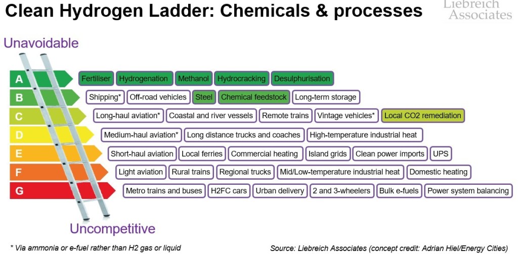 Michael Liebreich, oprichter van BloombergNEF, heeft een pragmatische rangorde opgesteld van waterstoftoepassingen op basis van technische en economische haalbaarheid. Zijn ladder bestaat uit vier niveaus: